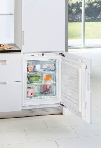 Встраиваемая морозилка может быть установлена как под столешницей, так и в колонну. Все зависит от ее размеров. Расположение устройства нужно предусматривать заранее, ведь оба варианта отличаются расположением решетки, необходимой для овода воздуха. Если модель рассчитана под столешницу, то решетка в ней будет находиться в цокольной части, а не в верхней.